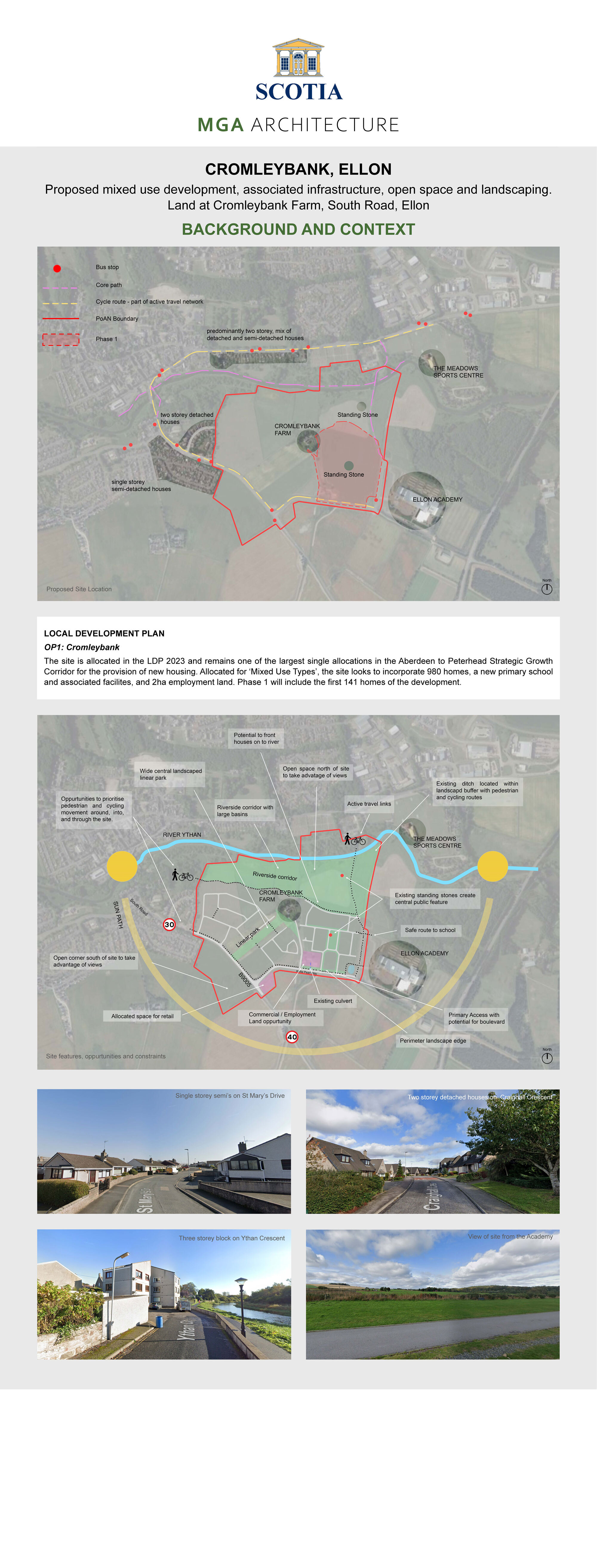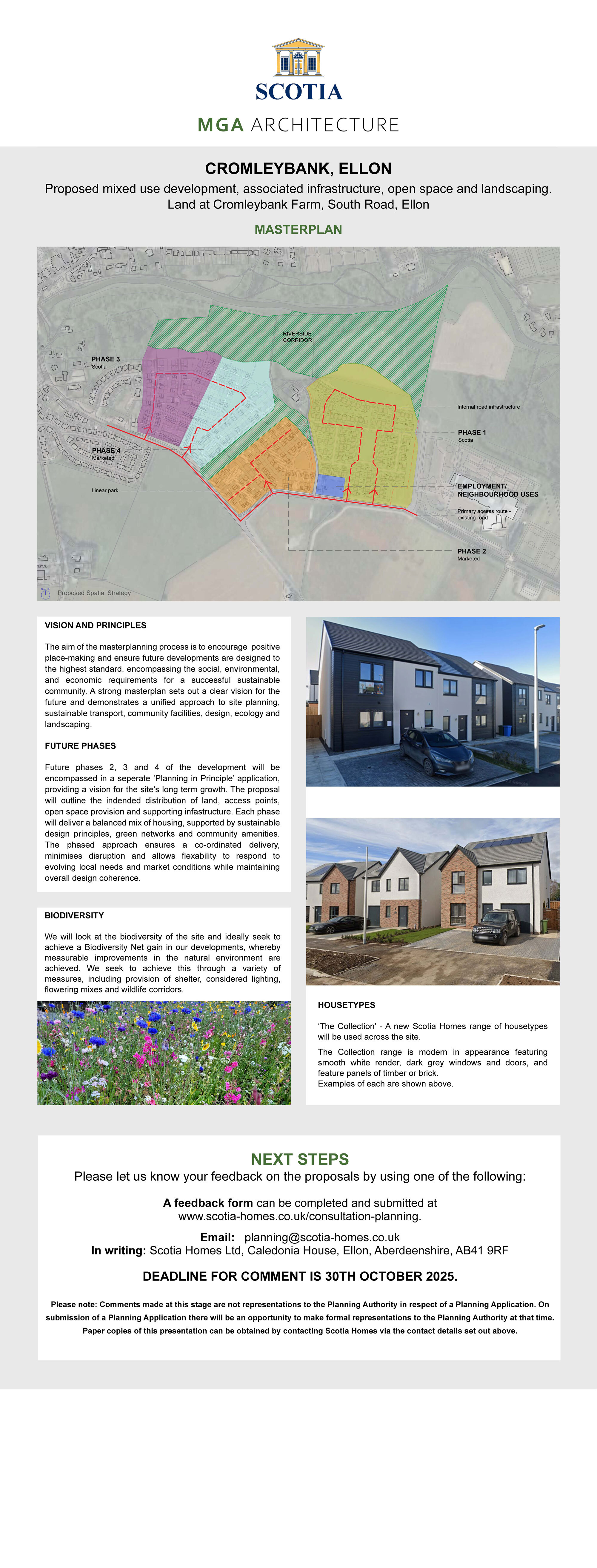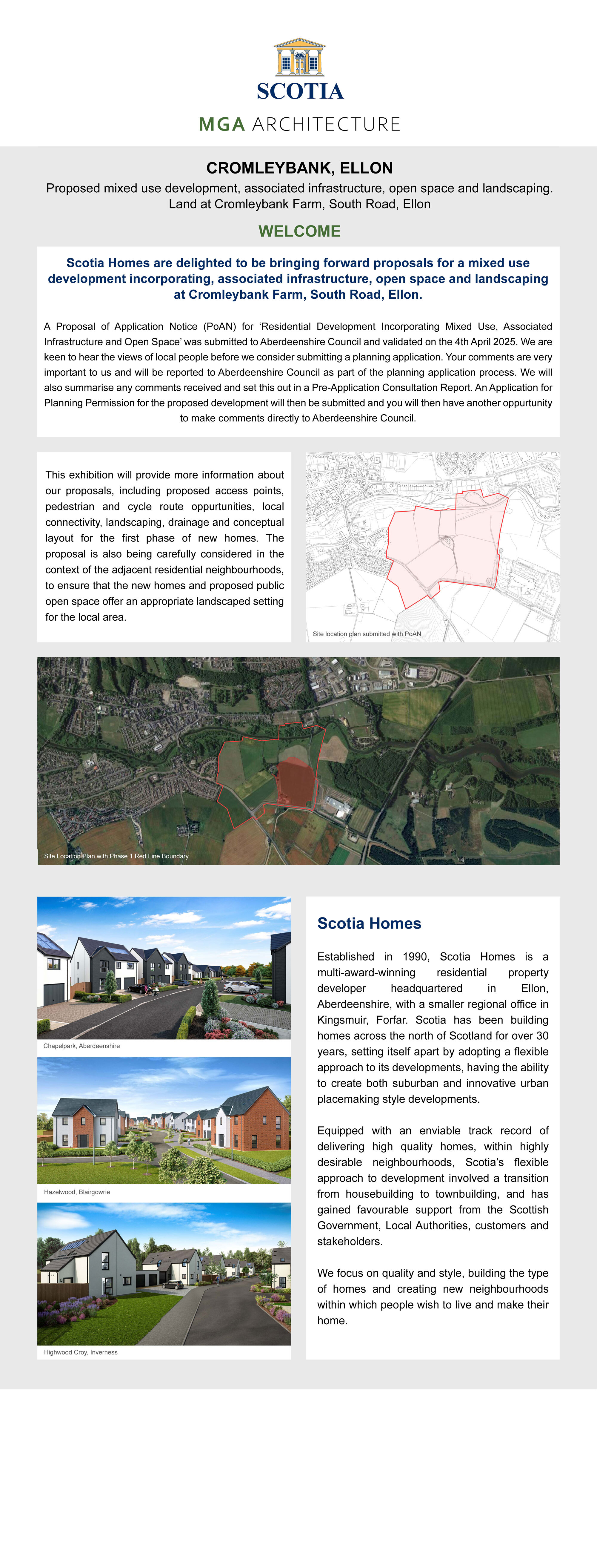 Scotia Homes are delighted to be bringing forward proposals for a mixed use development incorporating, associated infrastructure, open space and landscaping at Cromleybank Farm, South Road, Ellon
