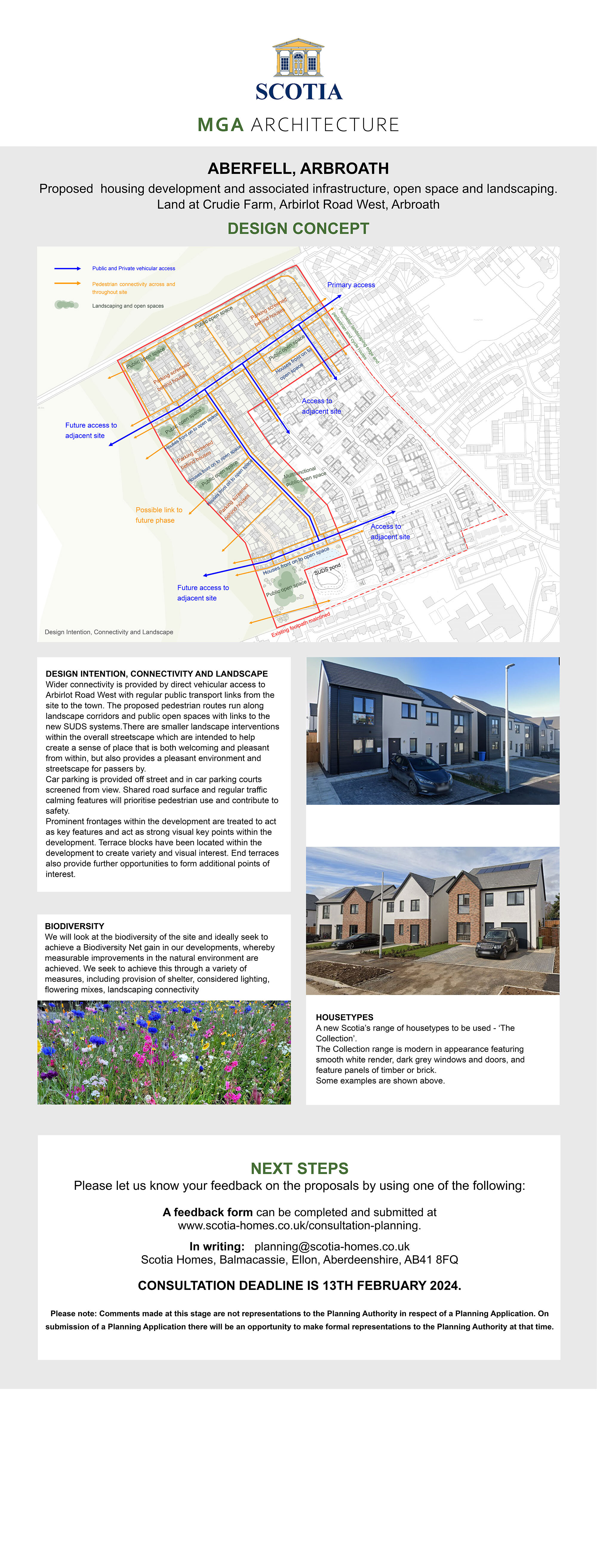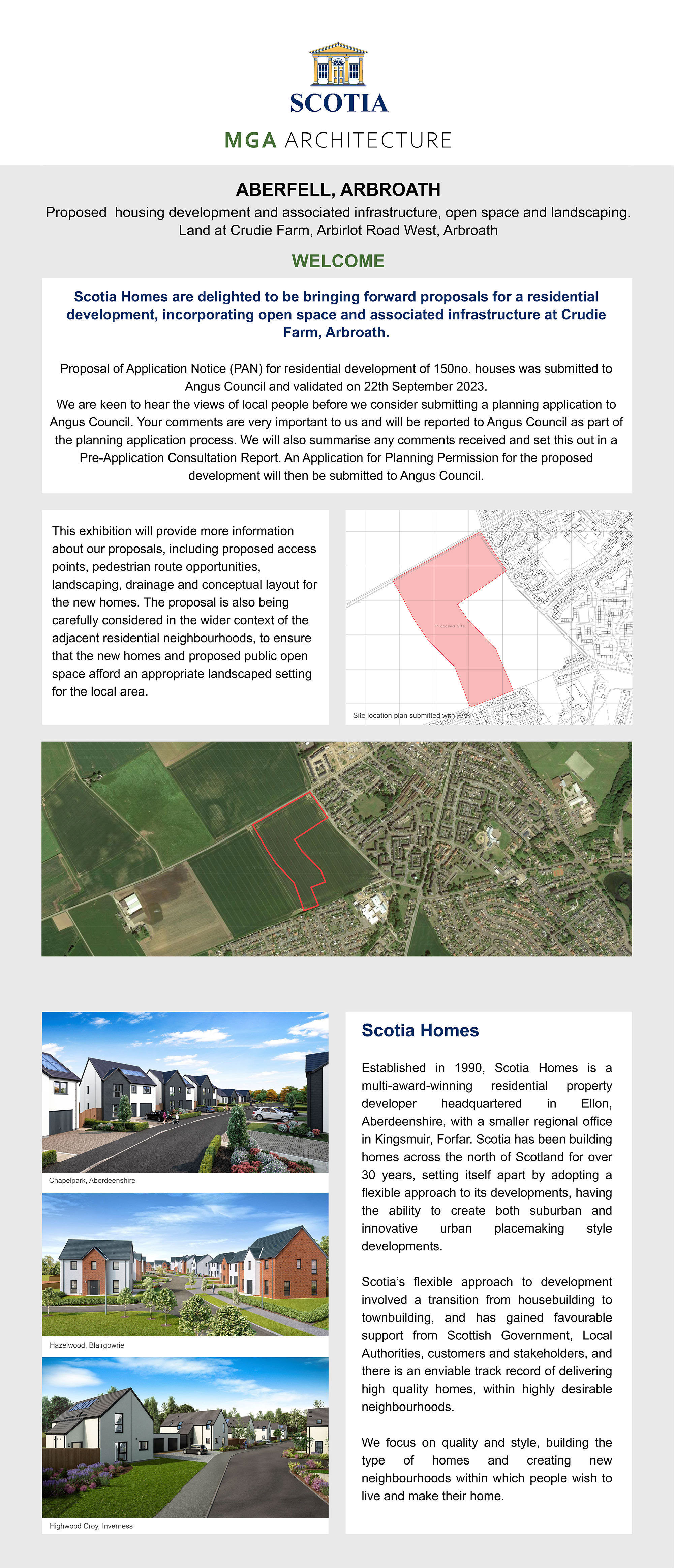 Welcome to Scotia Homes’ consultation event for the Phase 2 element of the proposed residential development on land at Crudie Farm, Arbroath. We are keen to hear the views of local people to ensure the development benefits the local community.