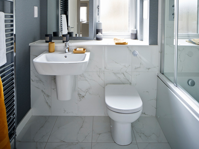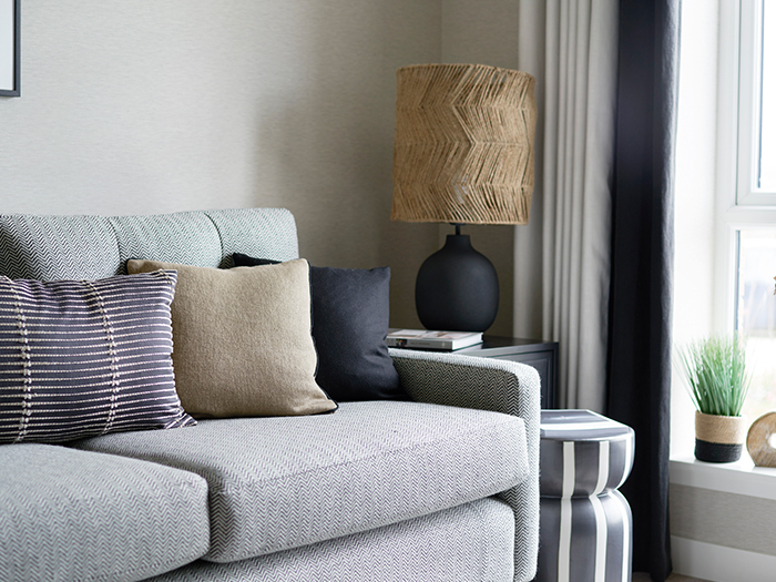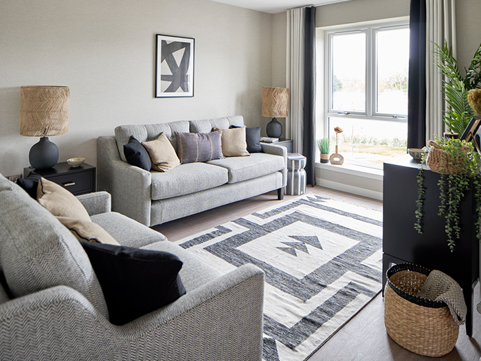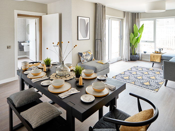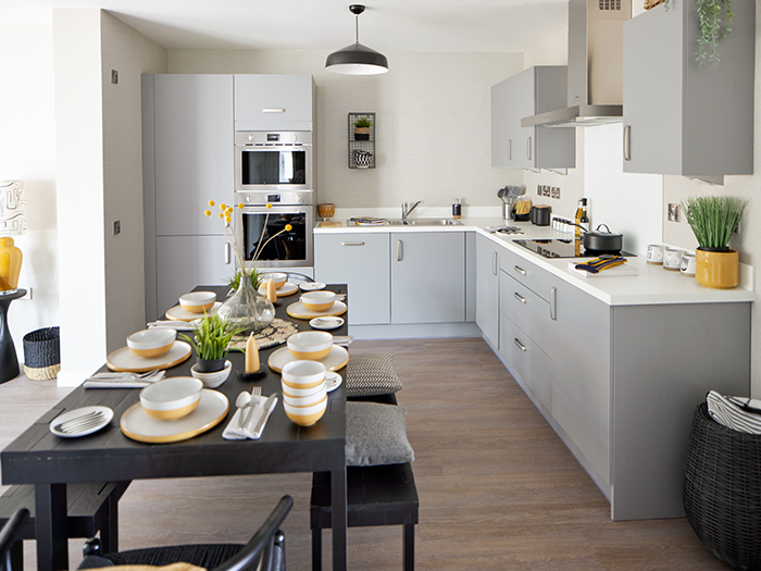 Moving through the showhome, the open plan kitchen/dining room continues the monochrome theme but with a stronger ochre hue.