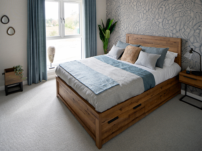 You’ll find an attractive textured wallpaper in the master bedroom, paired with a muted teal. The other bedrooms are kept to a similar palette, which is softened with the inclusion of rustic oak furniture.